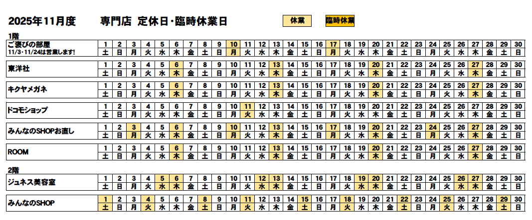 【11月度】館内専門店 定休日・臨時休業日について
